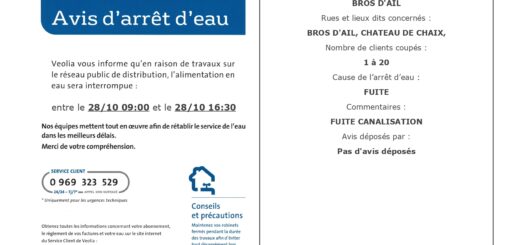 VEOLIA nous informe qu’en raison d’une fuite sur le réseau public de distribution, une coupure d’eau est prévue ce jour de 10h00 à 12h00 : – Brosd’Ail – Chaix – Le Tripot – Les...