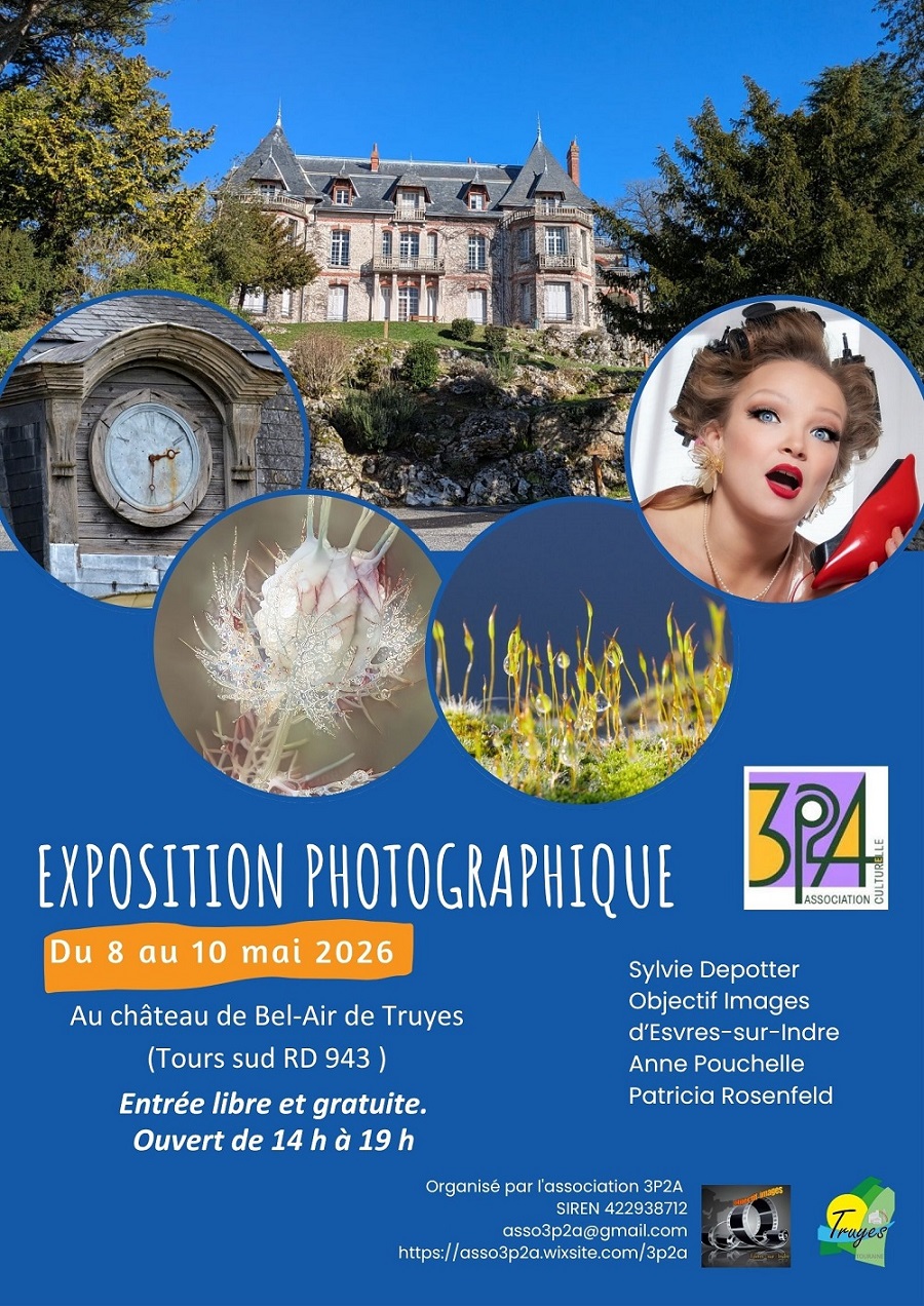 Notre association culturelle 3P2A se fera un plaisir de vous accueillir à son « exposition d’œuvres photographiques » dans les salons du château de Bel Air, rue du Château Jouan, à Truyes (37) le vendredi 8, le samedi 9 et le dimanche 10 mai 2026, de 14h à 19h.