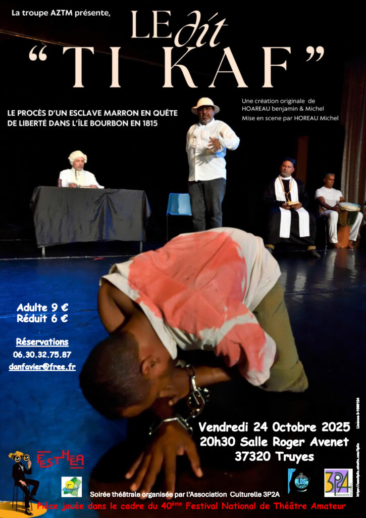 Pour ce “40ème Festival National de Théâtre Amateur“, nous aurons le plaisir d’accueillir la Cie « AZTM » de l’Île de la Réunion qui nous présentera “LE dit TI KAF“ de Benjamin et Michel Hoareau mis en scène par Michel Hoareau.