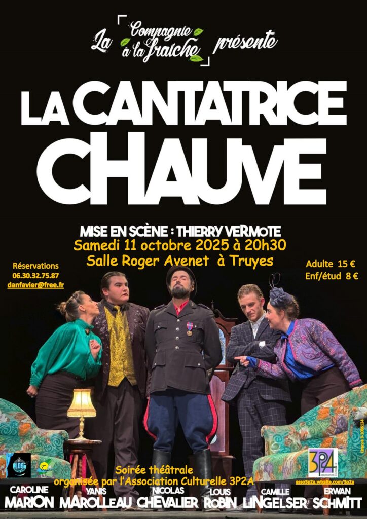 Notre association culturelle 3P2A organise une soirée théâtrale avec la pièce “La Cantatrice Chauve’’, interprétée par “La Compagnie à la Fraiche’’ et mise en scène par “Thierry Vermote’’. Elle aura lieu le samedi 11 octobre 2025 à 20h30 dans la salle Roger Avenet 2, rue du Clocher à TRUYES (37320).
